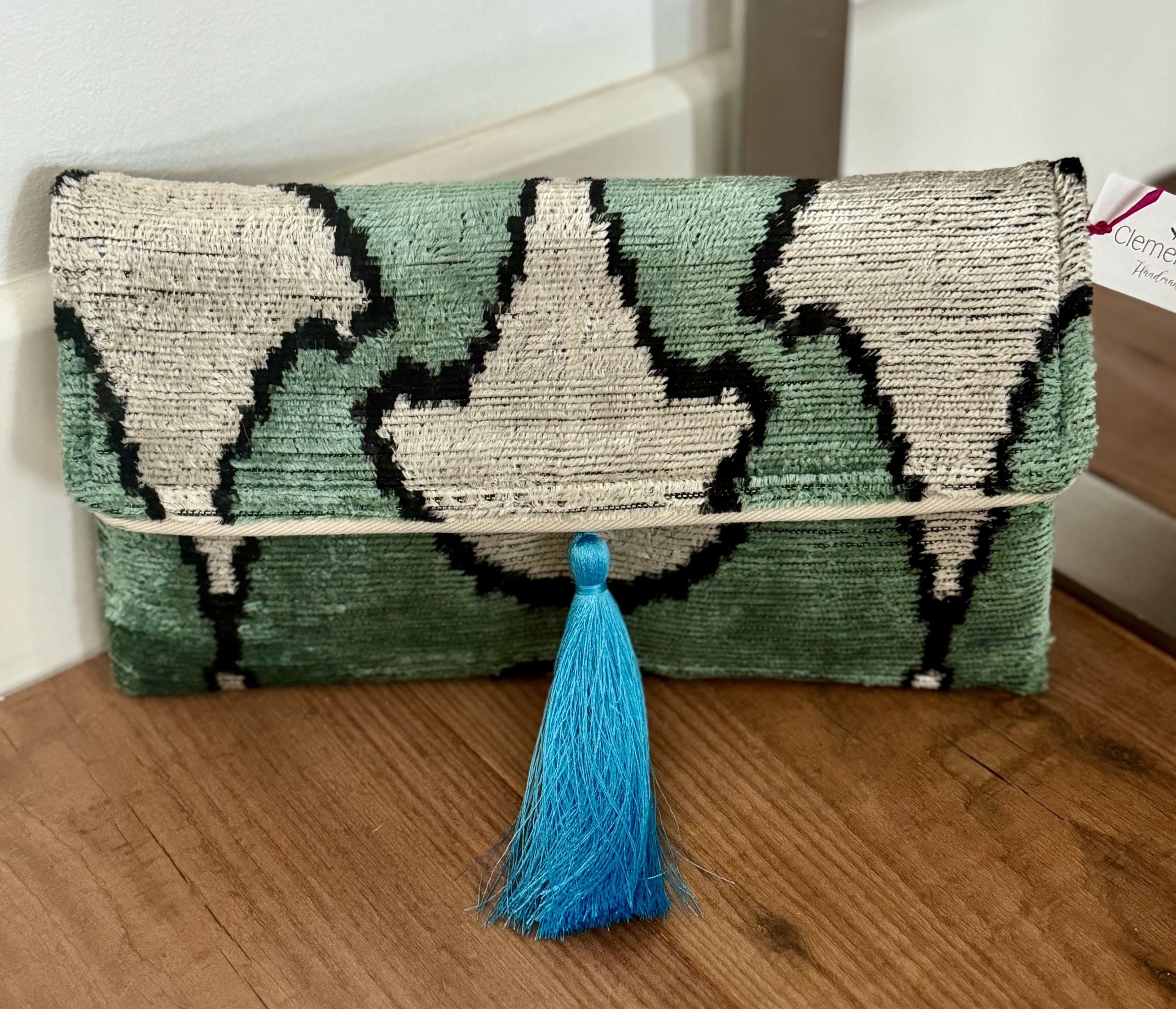 Bolso de mano en terciopelo seda tejido sobre una base de algodón 100% natural.